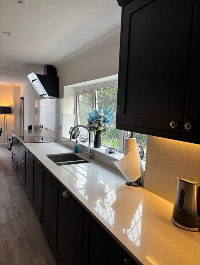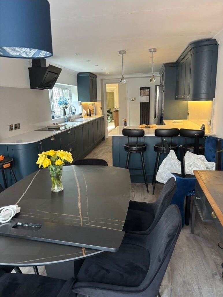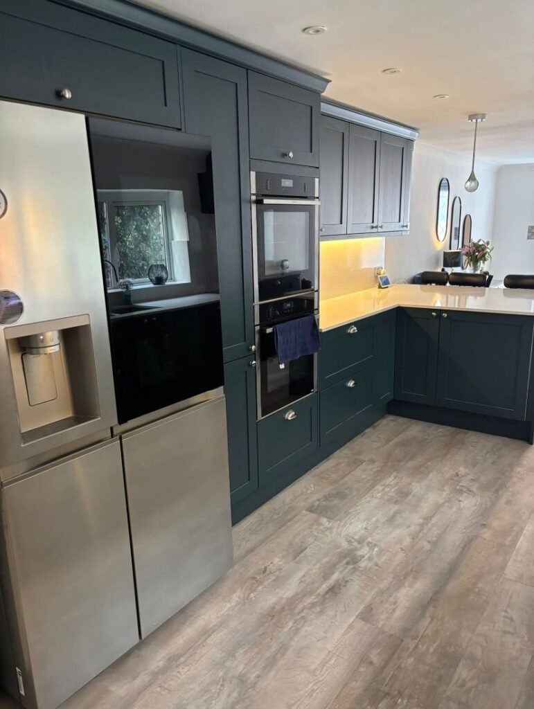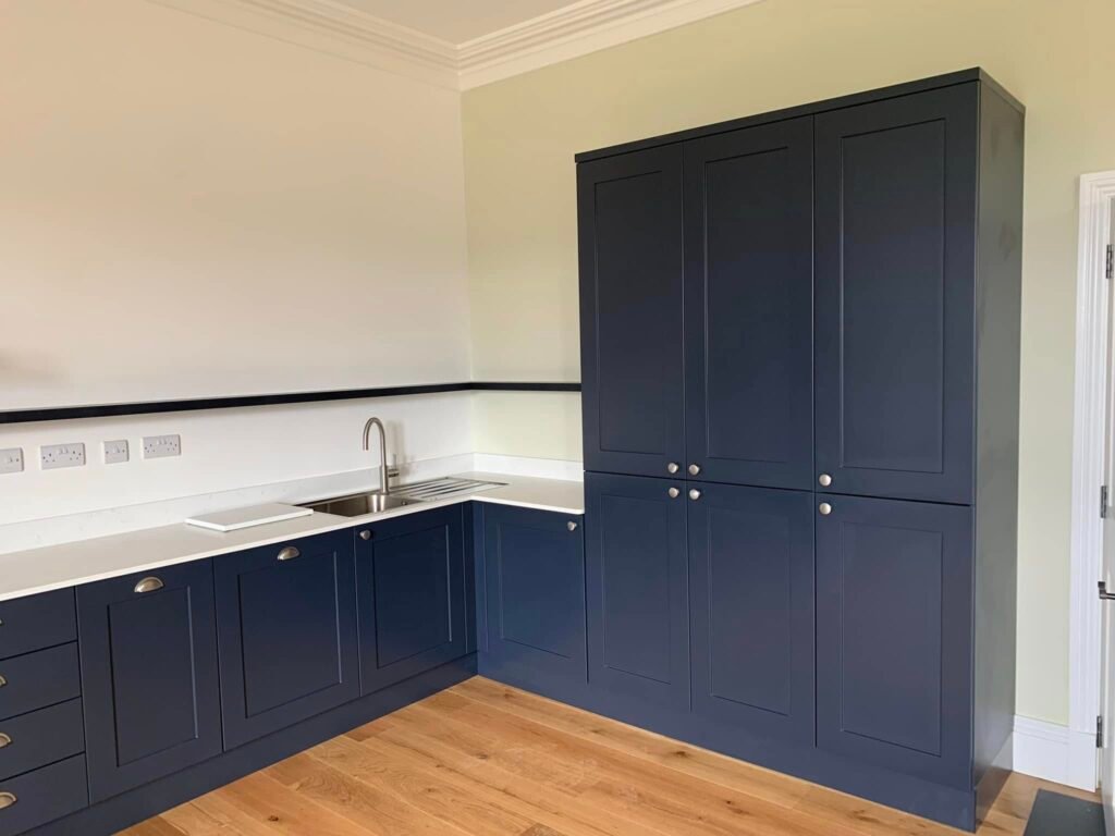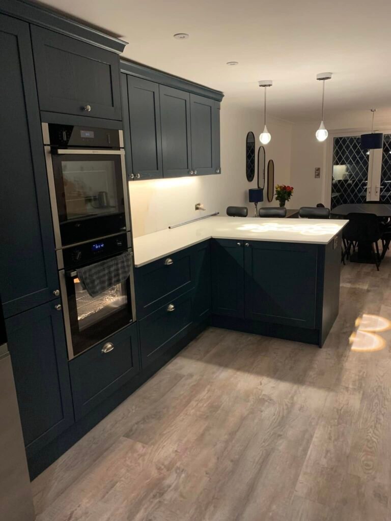 Kitchen renovation featuring the Aldana range in marine, and white quartz worktops and splashbacks.