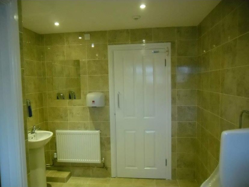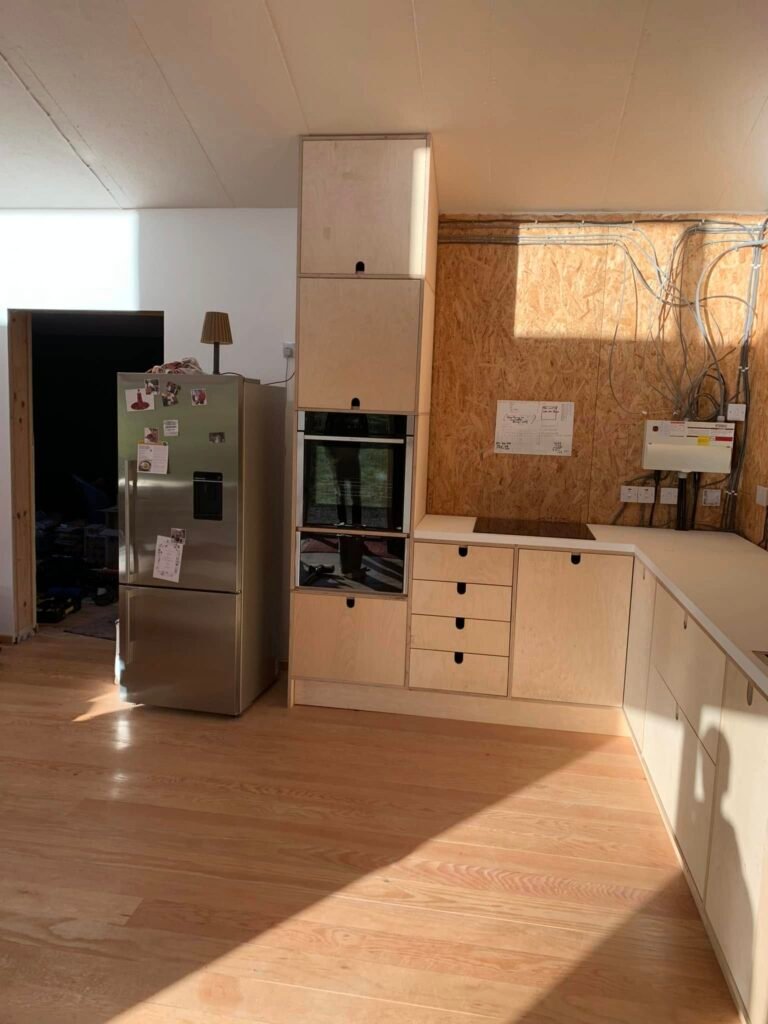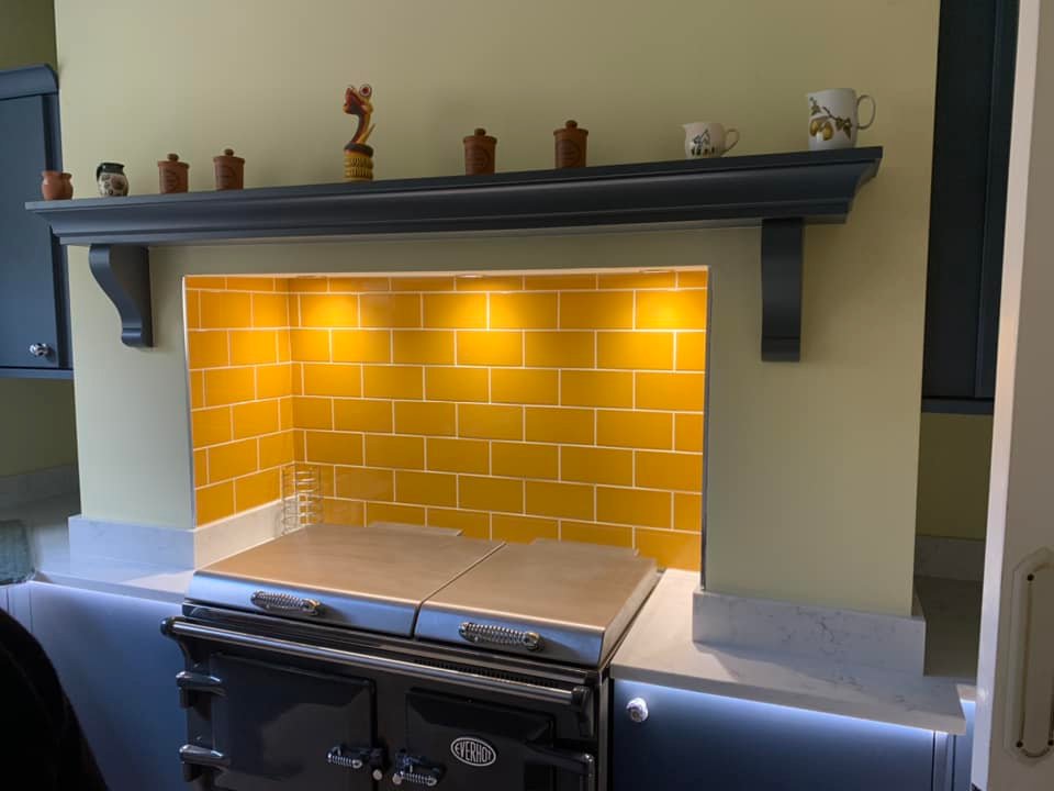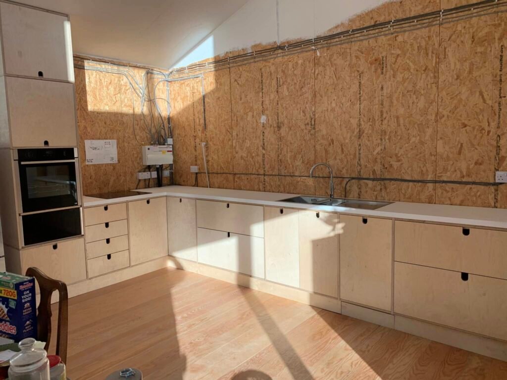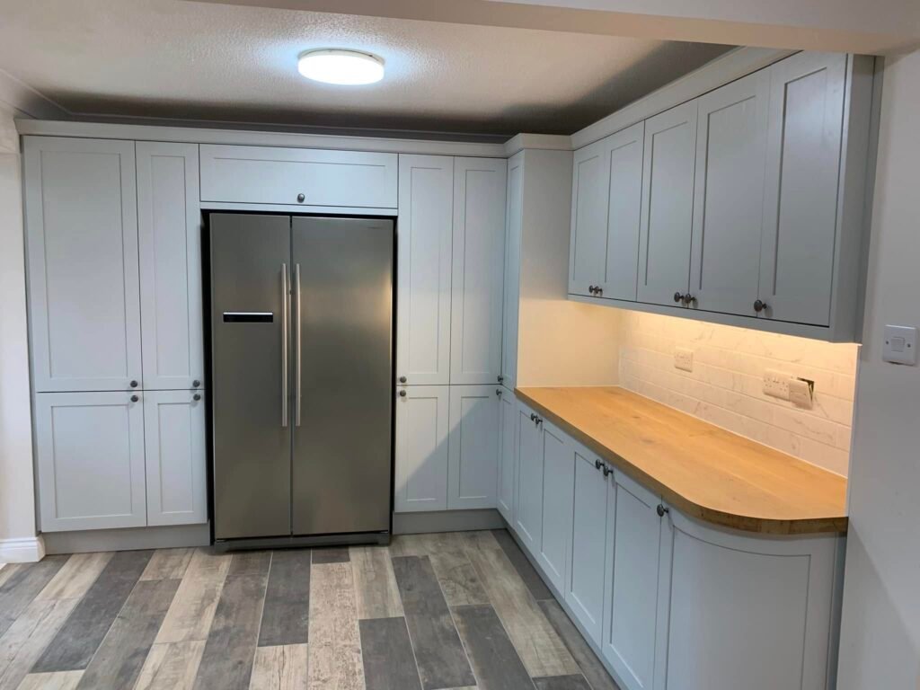 Kitchen renovation featuring the Aldana range in marine, and white quartz worktops and splashbacks.